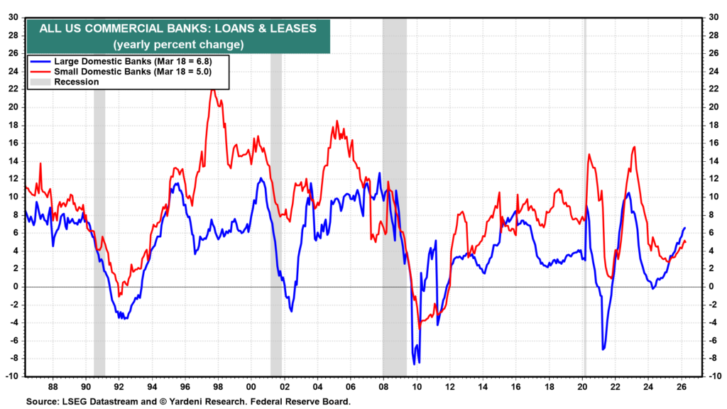 Loan growth. “Loan growth at US commercial banks remains very strong, with no sign of a credit crunch emerging. We suspect banks may be stepping up to purchase private loans at attractive distressed prices.”