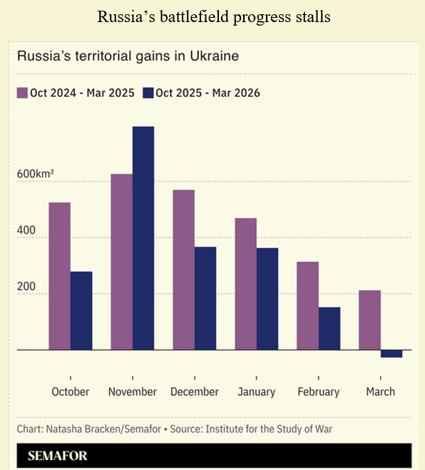 Russia made no territorial gains in March, the first time its progress has stalled entirely in more than two years. Ukrainian forces even recaptured small areas of territory, the Institute for the Study of War data showed. Moscow’s advance has been slowing since late last year: It took just 123 square miles in January and 47 in February, the smallest gains since April 2024. The ISW said Ukrainian counteroffensives were one reason, as well as technological issues that have hindered battlefield communication: Starlink has cut Russia’s access to its satellite internet, and the Kremlin prevented its own troops from using the messaging app Telegram in favor of a state-run option.